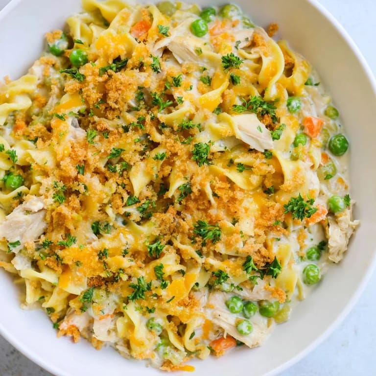 Pin It A comforting casserole combining tender noodles, creamy chicken soup, and melty cheese, baked to golden perfection for an easy and satisfying family meal.