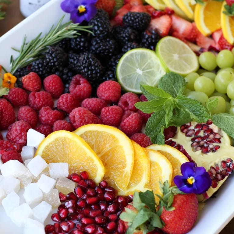 - Fresh Fruits: 1 cup fresh raspberries, 1 cup fresh blackberries, 1 cup fresh strawberries hulled and halved, 1 cup pomegranate arils, 2 lemons thinly sliced into rounds, 2 limes thinly sliced into rounds, 1 orange thinly sliced into half-moons, 1 cup seedless green grapes halved