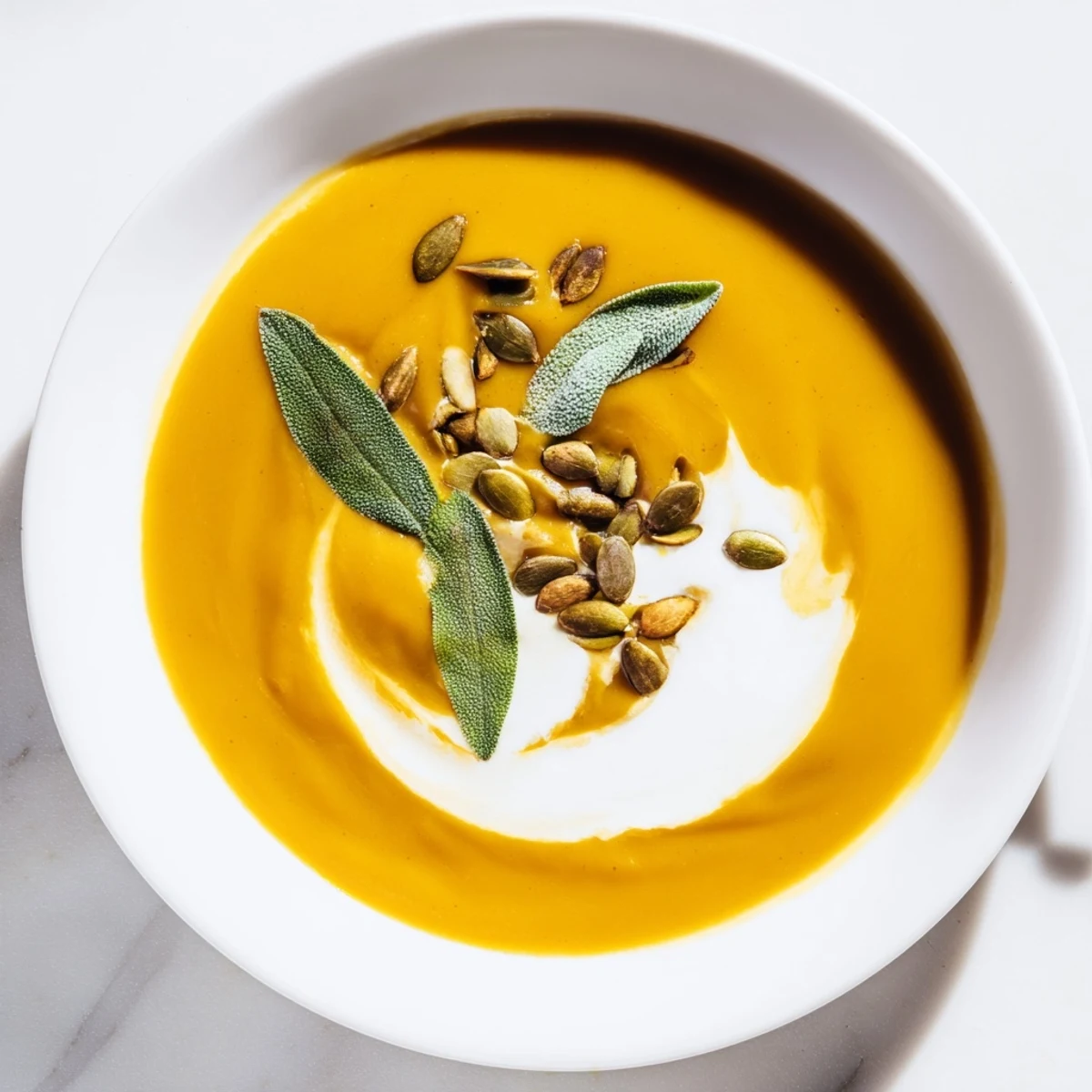 A swirl of cream or coconut milk adds richness, while roasted pumpkin seeds provide a crunchy contrast and fresh sage leaves add aroma.