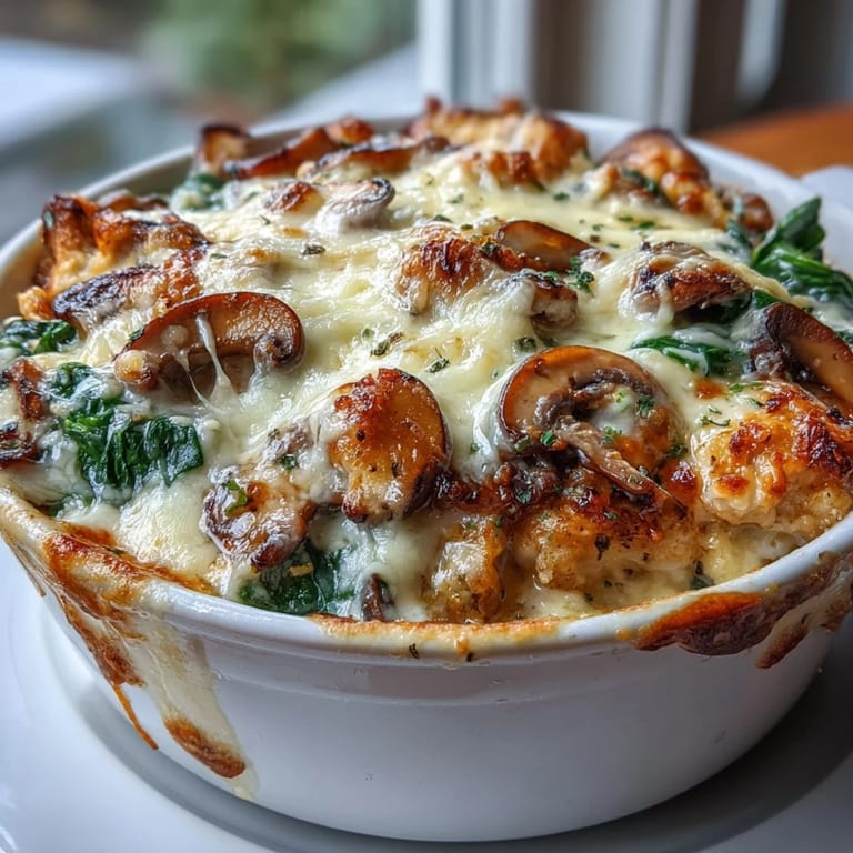 Pin It Savor the rich, comforting flavors of a home-cooked meal that fits perfectly into your healthy lifestyle. This Chicken Spinach & Mushroom Low Carb Oven Dish combines tender chicken breast with earthy mushrooms and fresh spinach, all enveloped in a creamy sauce and topped with a bubbly layer of melted cheese. It is the ideal solution for a satisfying, high-protein dinner that feels indulgent while keeping the carbohydrates to a minimum.
