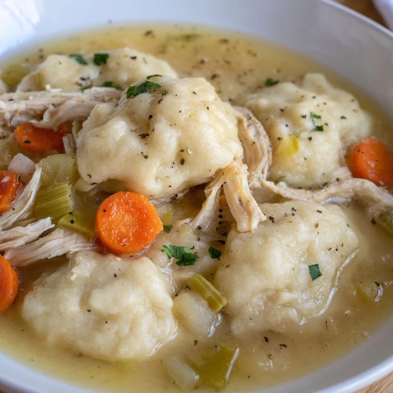 Pin It A comforting, hearty dish featuring tender chicken, fluffy dumplings, and a savory broth—perfect for cozy gatherings or family dinners.