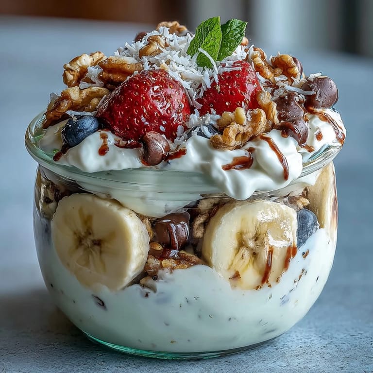 Pin It Imagine waking up to a breakfast that feels like dessert but nourishes your body with wholesome ingredients. The Fluffy Yogurt Banana Split Breakfast Jar brings the joy of a classic ice cream parlor treat to your morning table, layering creamy Greek yogurt with ripe bananas, vibrant berries, crunchy granola, and a hint of chocolate. It's a portable, no-cook delight that transforms breakfast into a celebration—perfect for busy mornings or leisurely weekend brunches.