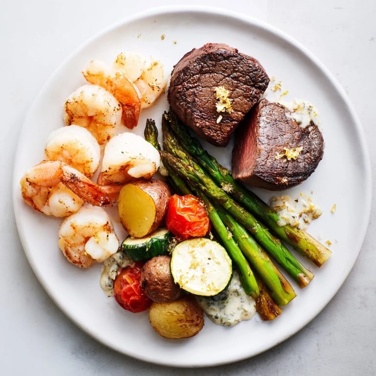 - Meats & Seafood: 2 (200 g each) filet mignon steaks, trimmed; 8 large sea scallops, cleaned; 8 jumbo shrimp, peeled and deveined; 50 g smoked salmon slices