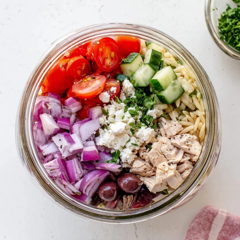 Pin It My coworker Marie used to bring these jars every Monday, and I'd watch her shake hers like a snow globe before dumping it into a bowl. The colors alone made my sad desk sandwich look pitiful. One afternoon she let me try a forkful, and the briny punch of olives against creamy feta had me scribbling down her instructions on a Post-it. Now I make a batch every Sunday night, and my lunch breaks feel less like refueling and more like a tiny vacation.