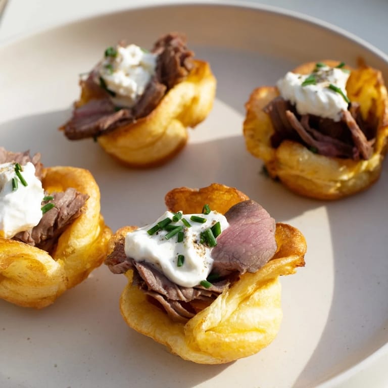 Pin It Delightful mini Yorkshire puddings, golden and crisp, filled with savory roast beef and creamy horseradish — perfect for festive entertaining or as an elegant appetizer.