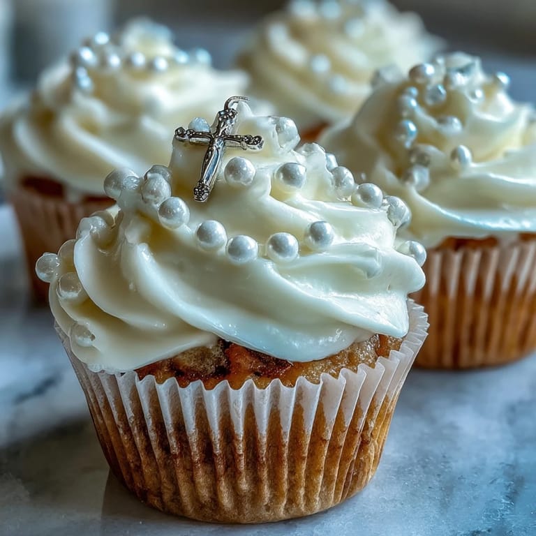 Pin It My sister called me in a panic three weeks before her daughter's First Communion, asking if I could make something special for the celebration. I'd never attempted fondant toppers before, but something about creating tiny rosaries by hand felt right for such a meaningful day. These delicate vanilla cupcakes with their creamy frosting and handcrafted fondant rosaries became my answer, and watching that little girl's face light up when she saw them made every careful bead worth it.