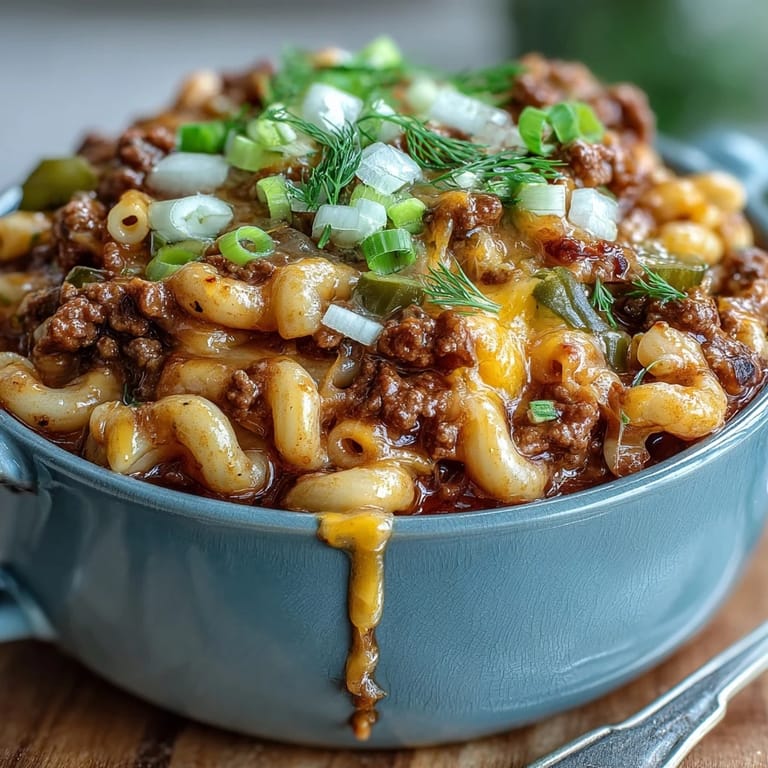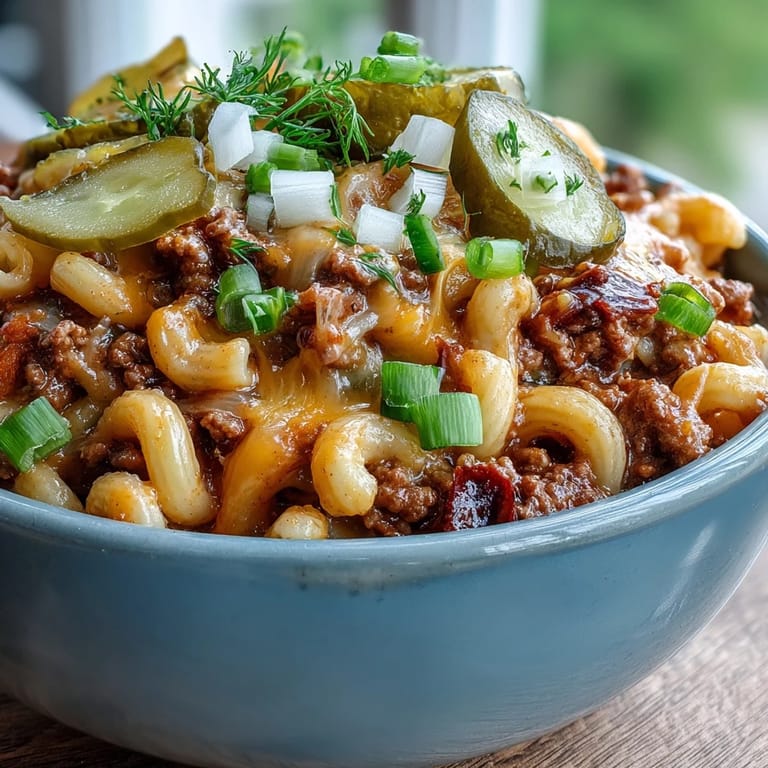 Serve this dish hot in deep bowls, garnished with extra dill pickles for crunch and a sprinkle of chives. If you enjoy a bit of heat, a dash of hot sauce stirred in at the end provides a delicious spicy kick that complements the cheddar cheese.