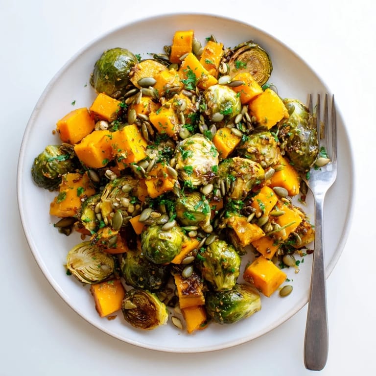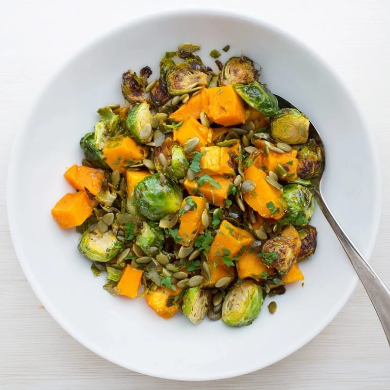 Pin It A vibrant, healthy side dish featuring caramelized Brussels sprouts and butternut squash, tossed in a fresh citrusy orange dressing—the perfect companion for any meal.