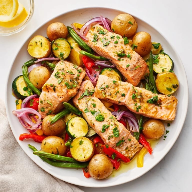 Pin It A flavorful one-pan meal featuring tender salmon pieces, golden potatoes, and vibrant vegetables, perfect for stretching a smaller portion of salmon into a satisfying, balanced dish.