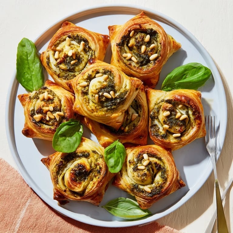 Pin It Flaky puff pastry pinwheels filled with vibrant basil pesto and nutty Parmesan, shaped into cheerful stars perfect as a festive appetizer or party snack.