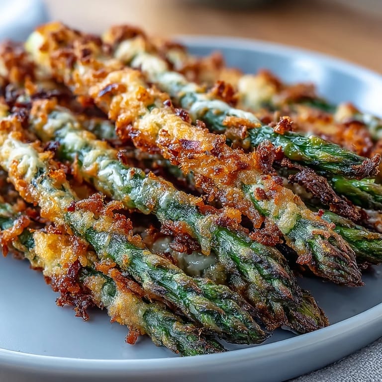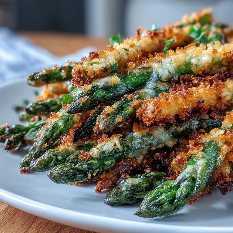 Pin It Experience the ultimate crunch with these Crispy Chili-Garlic Asparagus Fries. These fresh spears are enveloped in a savory crust of panko, Asiago cheese, and smoky spices, then oven-baked to golden perfection. Served alongside a creamy sriracha mayo dip, they offer a delightful balance of heat and texture that makes them an irresistible appetizer or side dish.