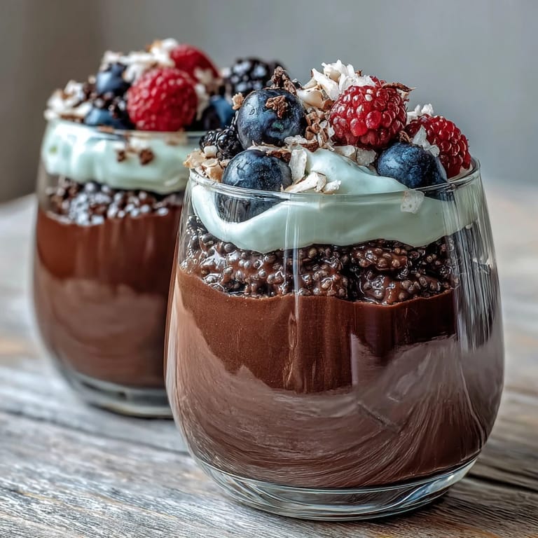 Serve these parfaits in tall glasses or small mason jars to showcase the elegant layers. Garnish with a mix of fresh raspberries and blueberries for a vibrant pop of color against the dark chocolate pudding.